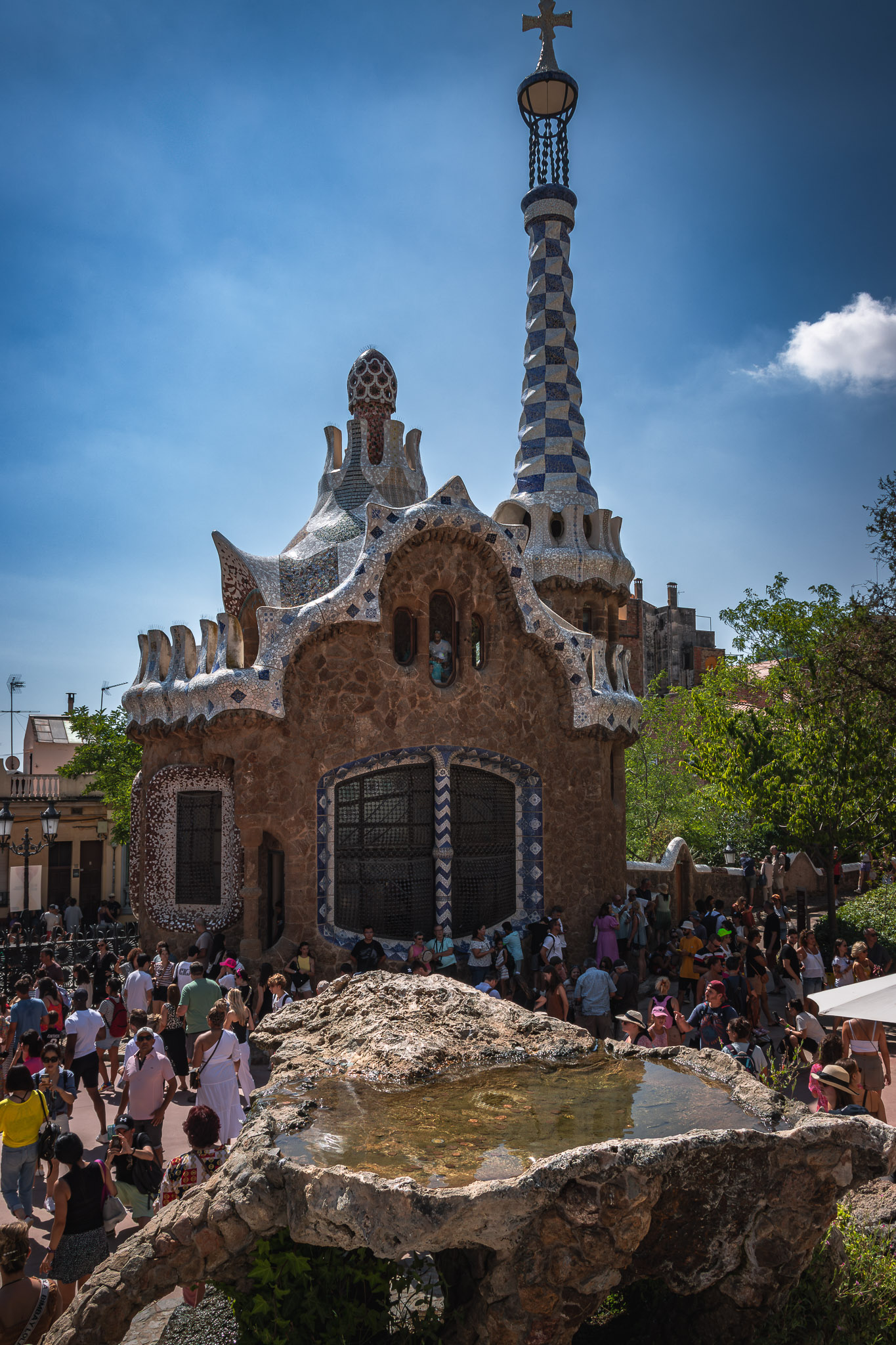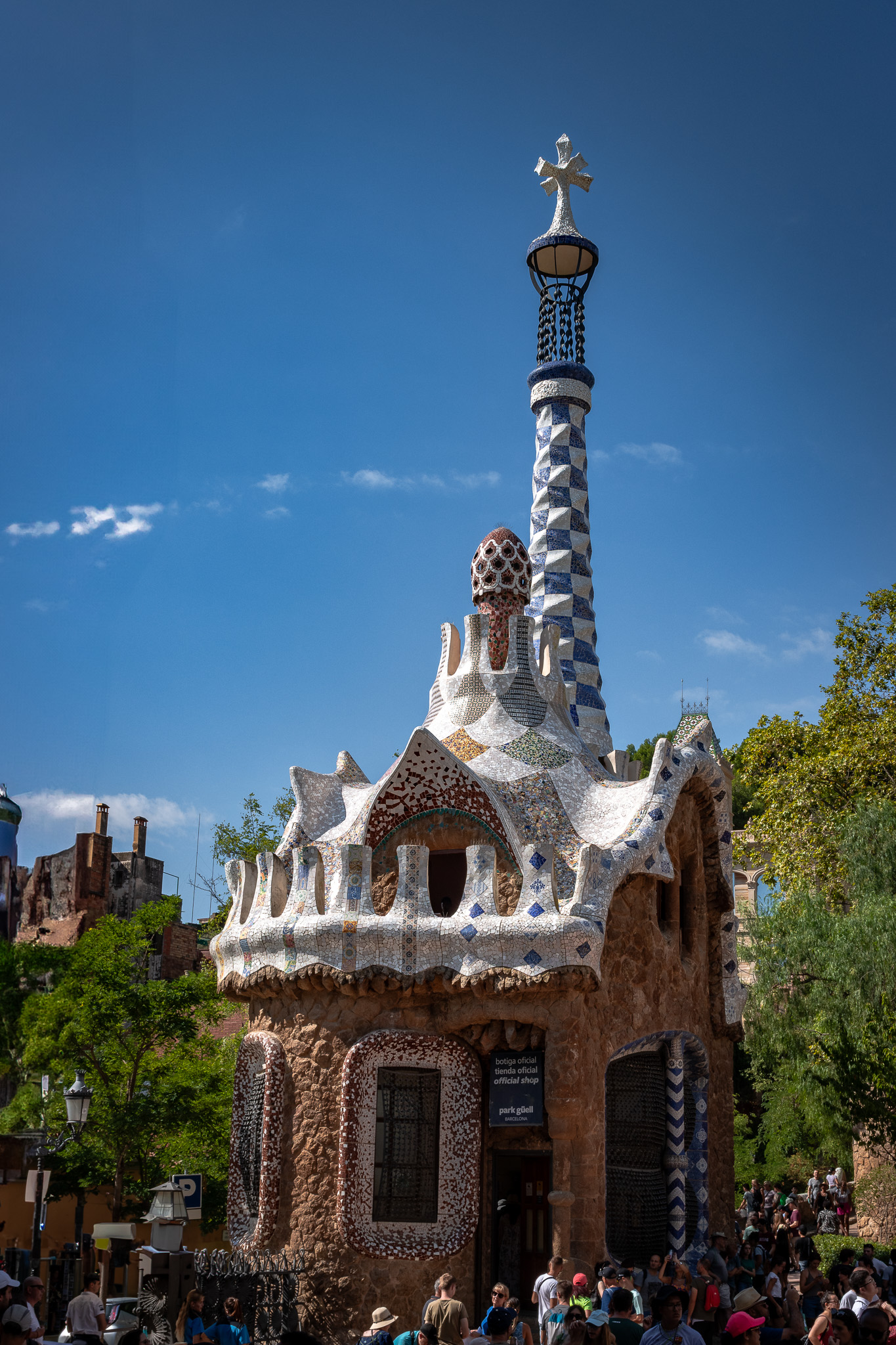Wejście do parku prowadzi przez monumentalną bramę główną z charakterystycznymi pawilonami administracyjnymi, które swoimi organicznymi formami przypominają bajkowe domki z piernika. Te niezwykłe budowle pokryte są kolorowymi mozaikami trencadís - techniką wykorzystującą fragmenty ceramiki, która stała się charakterystyczna dla stylu Gaudíego. Lewy pawilon mieści obecnie centrum interpretacji parku, prawy funkcjonuje jako sklep z pamiątkami.