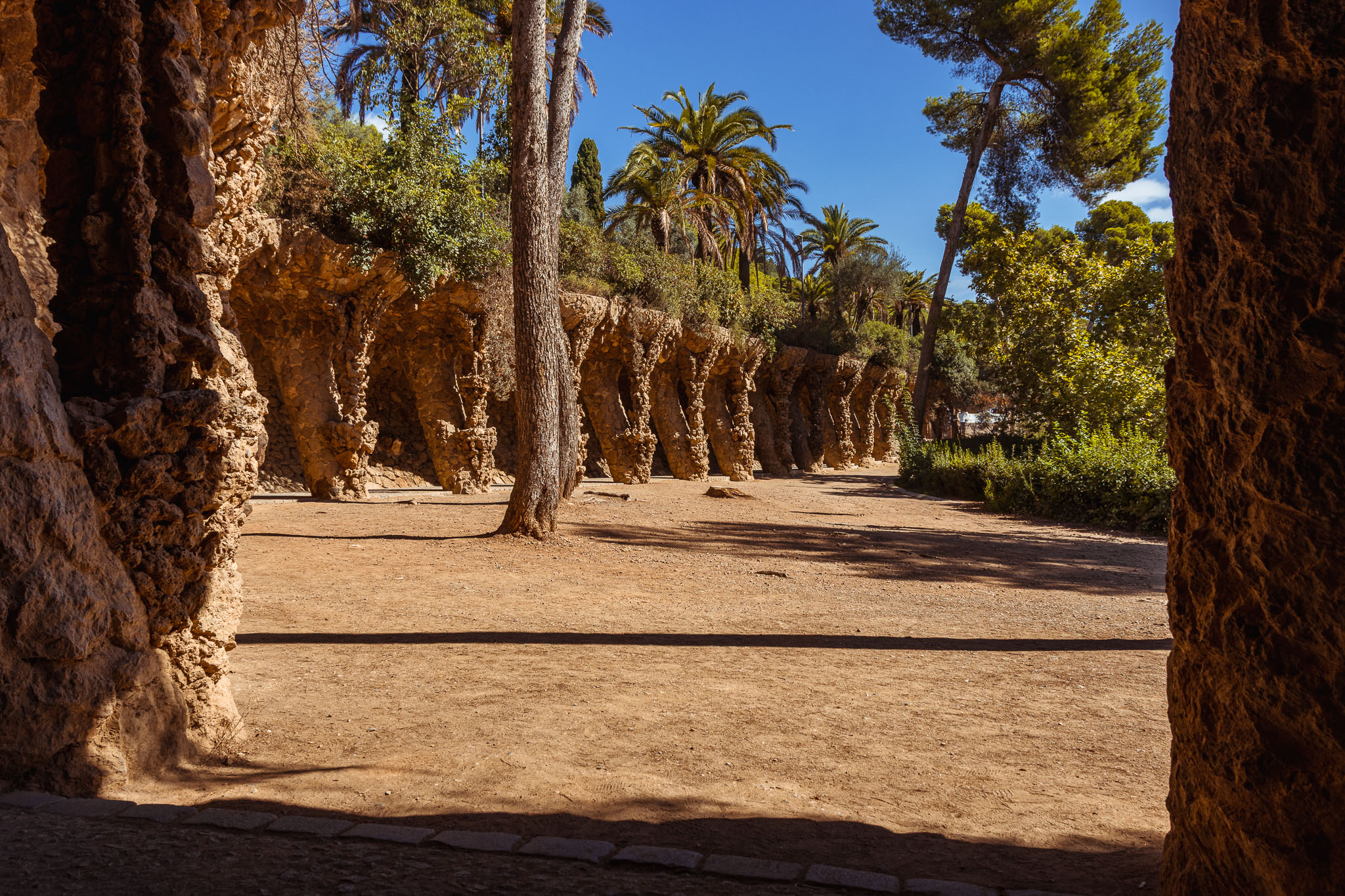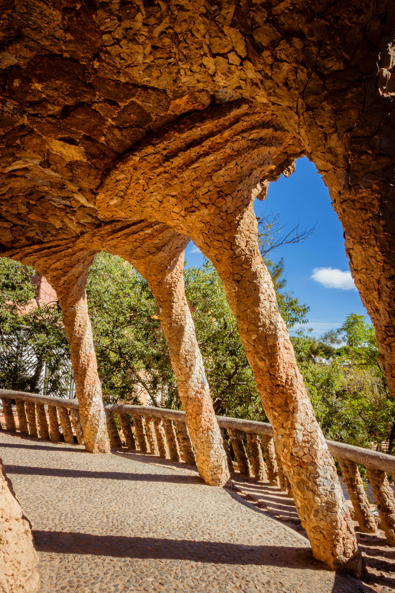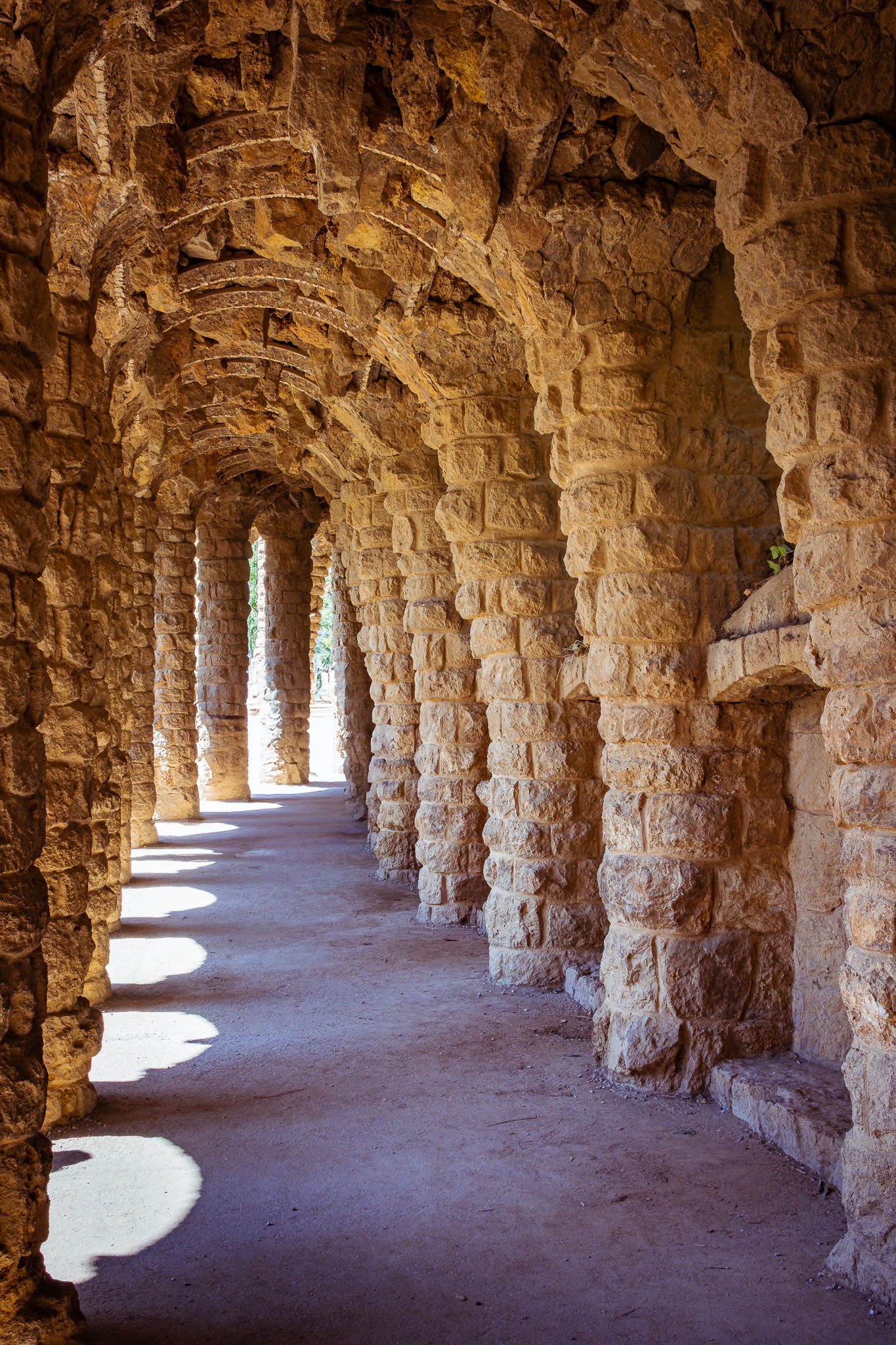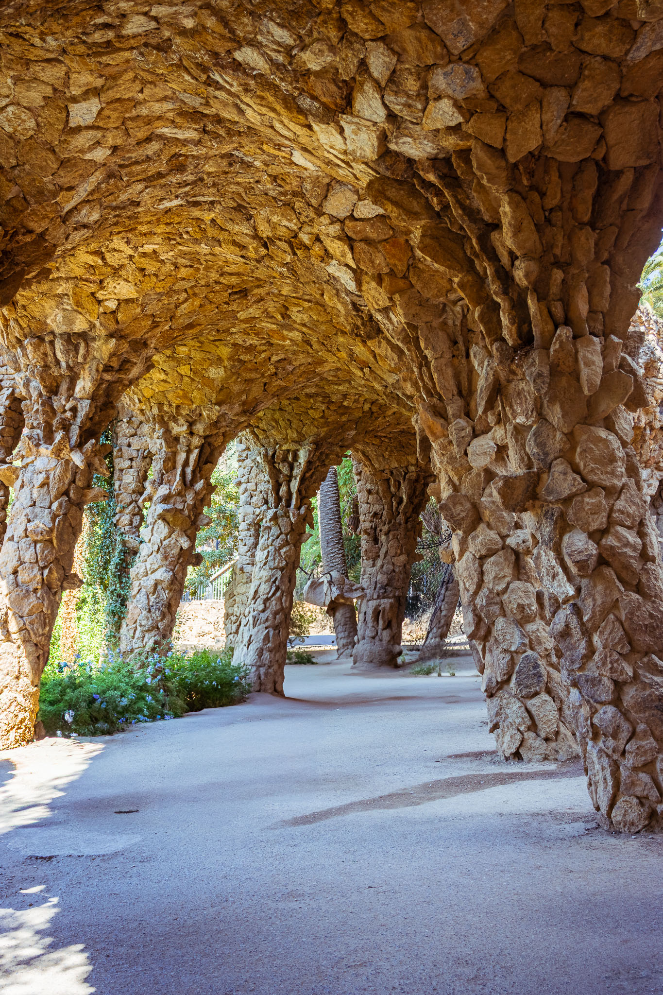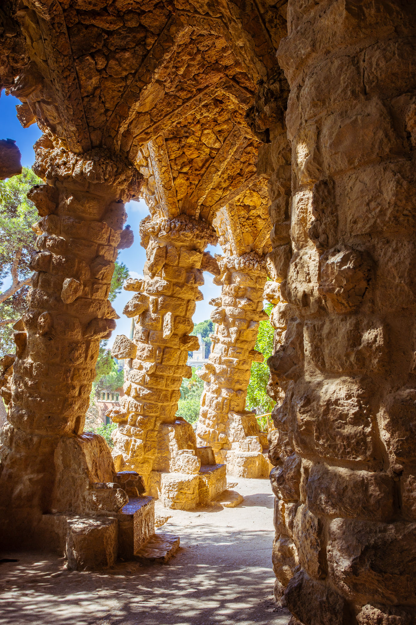 Park Güell to znacznie więcej niż tylko przestrzeń rekreacyjna - to manifest filozofii architektonicznej Gaudíego, który wierzył w harmonię między człowiekiem, naturą i architekturą. Architekt wykorzystał naturalne ukształtowanie terenu, tworząc wiaduktów i ścieżek, które organicznie wpisują się w krajobraz. Kolumny naśladujące pnie drzew, sklepienia przypominające groty i organiczne formy inspirowane światem roślinnym tworzą unikalną syntezę sztuki i natury.