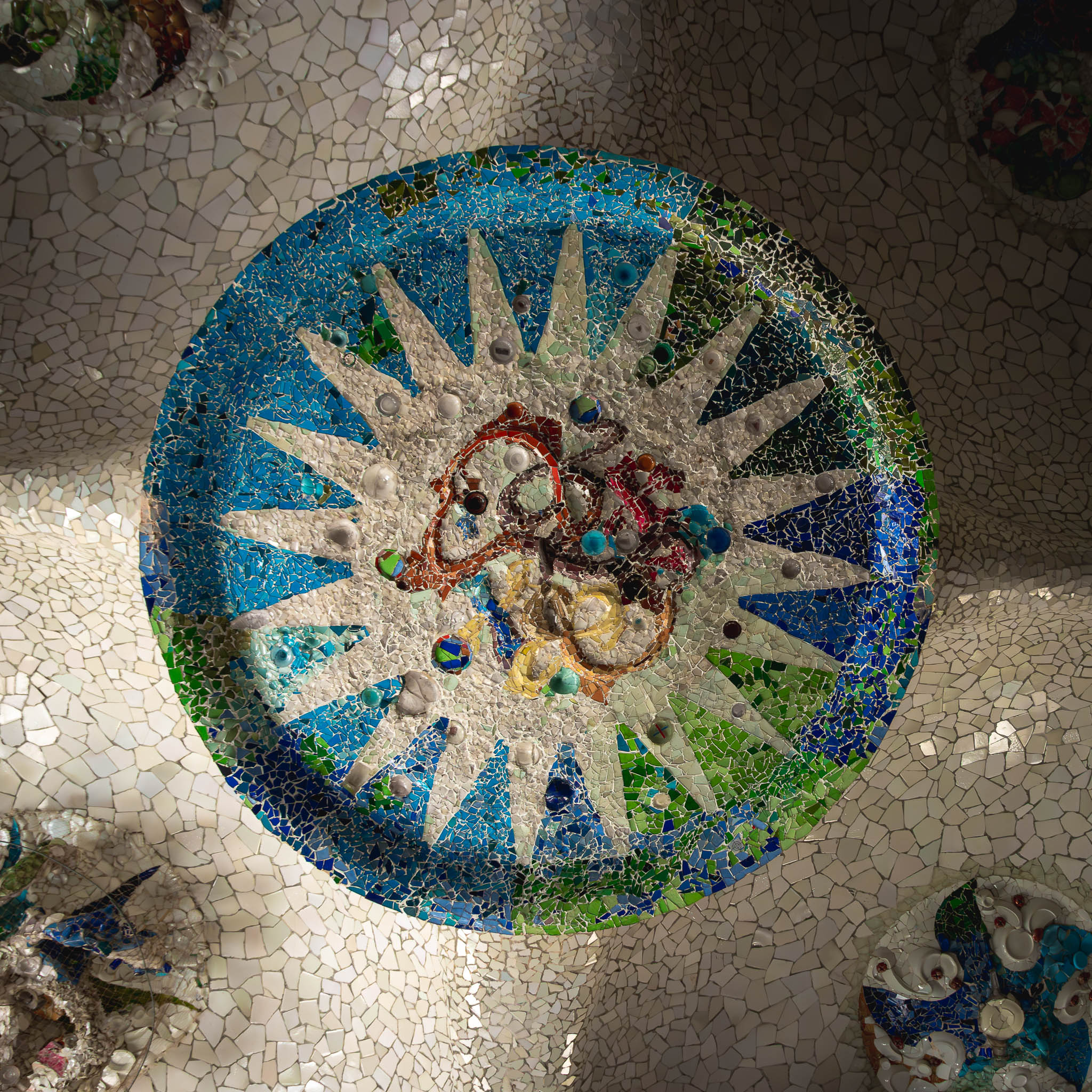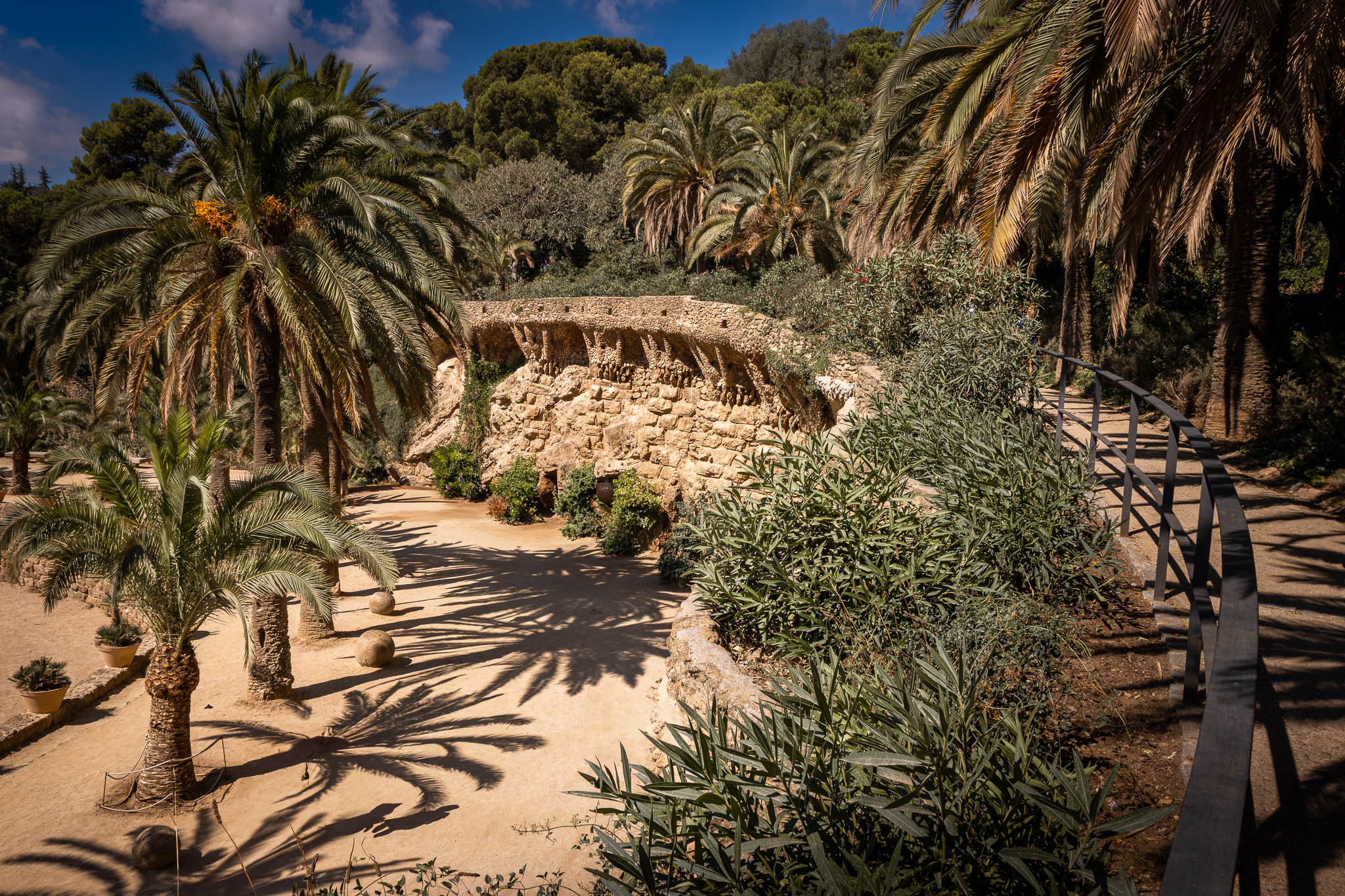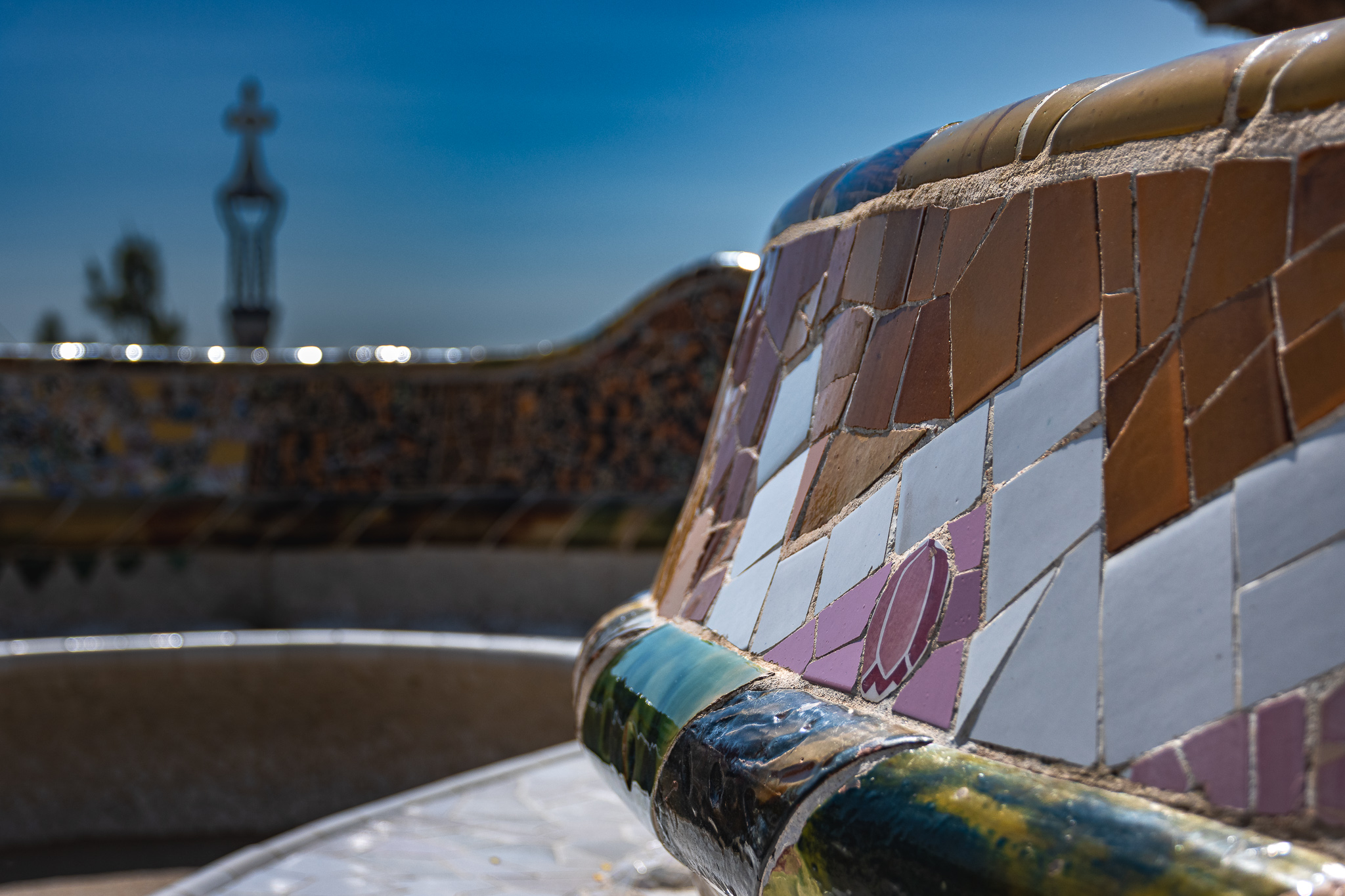 Centralnym punktem parku jest Plaça de la Natura - okrągły taras otoczony najsłynniejszą ławką świata. Ta serpentynowa ława o długości 110 metrów, pokryta wielokolorowymi mozaikami, została zaprojektowana przez ucznia Gaudíego, Josepa Marię Jujola. Każdy fragment ławki ma unikalny wzór i kolorystykę, tworząc kalejdoskop barw i form. Taras podtrzymywany jest przez Salę Stu Kolumn (Sala Hipóstila), która mimo nazwy liczy 86 dorycznych kolumn. Ta przestrzeń, pierwotnie zaprojektowana jako targ, zachwyca grą światła i cienia.