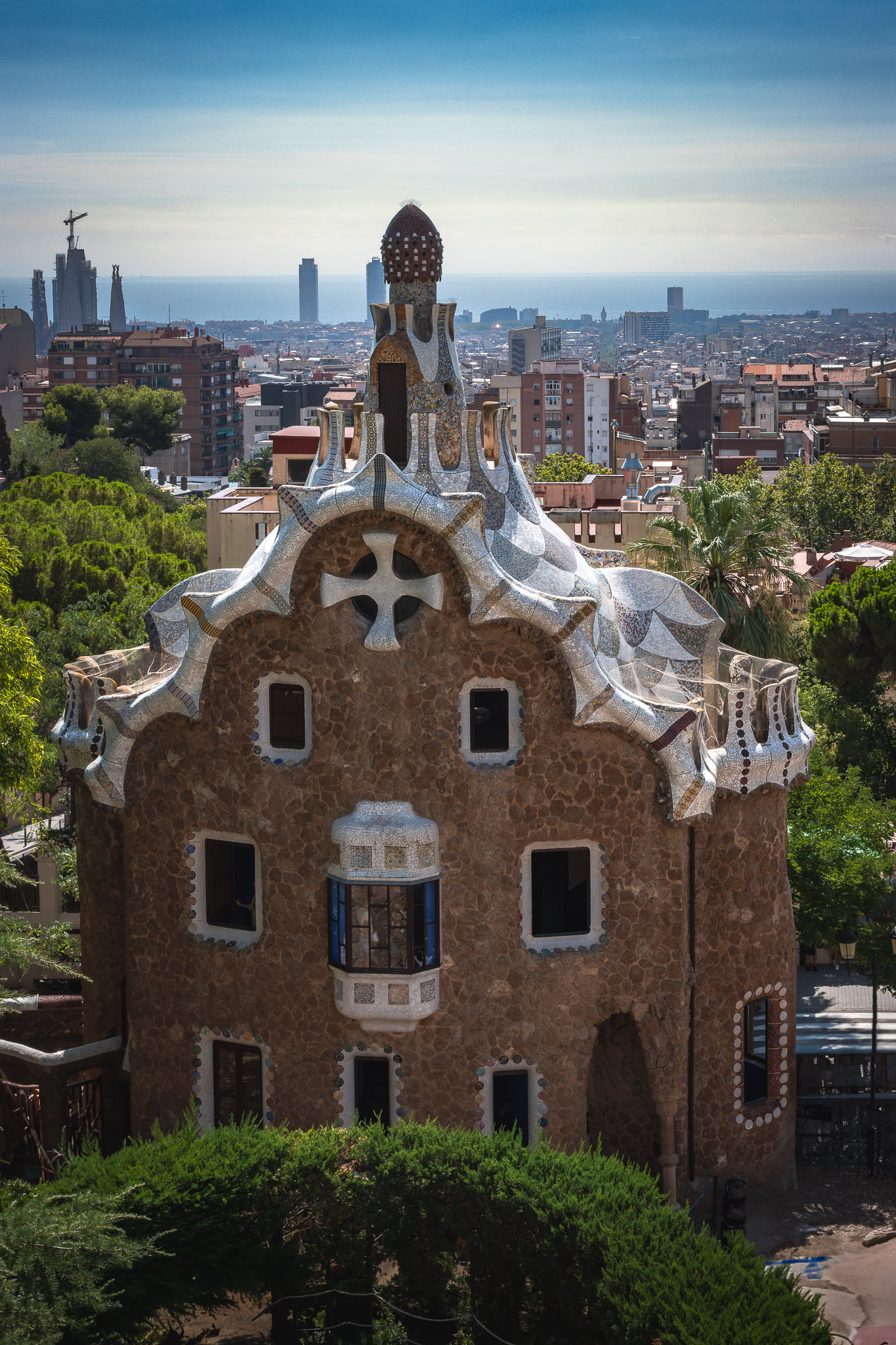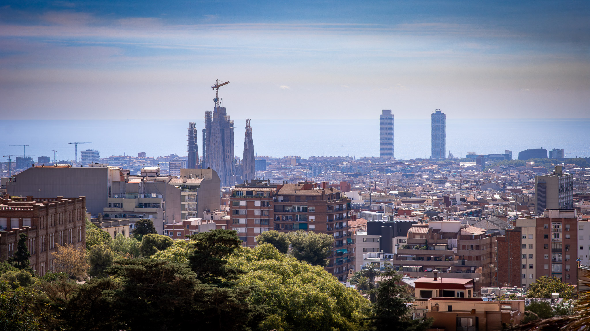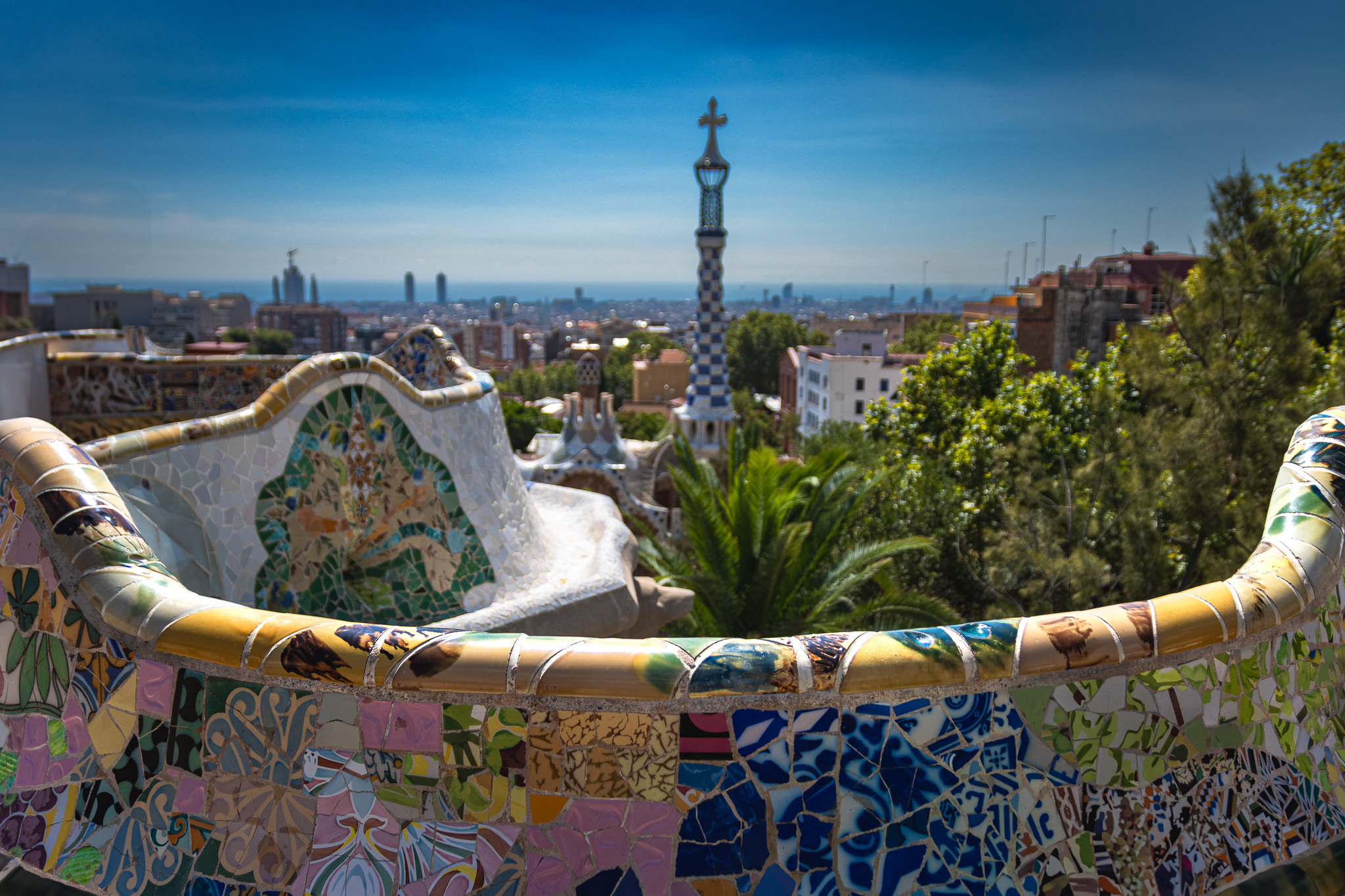 La Sagrada Familia na horyzoncie. Najlepsze ujęcia fotograficzne można wykonać ze schodów prowadzących do Calvario - najwyższego punktu parku, szczególnie podczas złotej godziny przed zachodem słońca, kiedy miękkie światło podkreśla kolory mozaik i sylwetkę miasta.